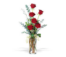 Six red roses with eucalyptus in a glass