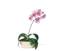 One lavender phalaenopsis orchid arrives in a ceramic dish with bark chips. Approximately 19" W x 10" H