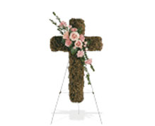 moss-covered cross features a diagonal swag of peach roses and pink