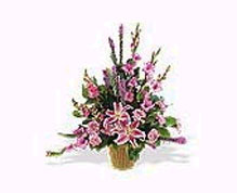purple liatris, pink snapdragons and lilies, and soft cascading foliage