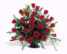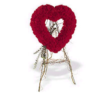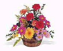 red carnations, a yellow gerbera, snapdragons, solidaster and lavender